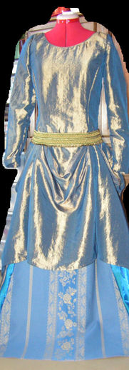 Elle est composée d'une sous-jupe bleue de tissus assortis : l'un vert d'eau irisé d'un voile bleu nuit avec au centre devant un tissu aux motifs de roses or blanchi reprenant aussi un motif de spirales. La robe de dessus est de couleur verte aux reflets bronze et reflets bleu indigo. La couleur dominante de la robe fait également allusion aux "enfants Indigo" et reprend le motif de la rose cher à l'artiste. La robe est terminée le 19 septembre 2019. Premières photos avant une séance photo en extérieur...