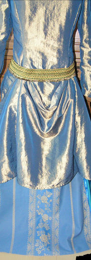 La sur-jupe est faite d'un voile d'organza assorti qui donne un caractère léger et vaporeux suggérant la magie, la féérie. Le parement d'épaules est aussi en organza. Achevée le 22 mai 2018.